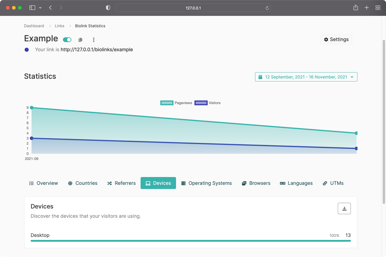 Day by day analytics, referrers, countries, operating systems, languages and many more.